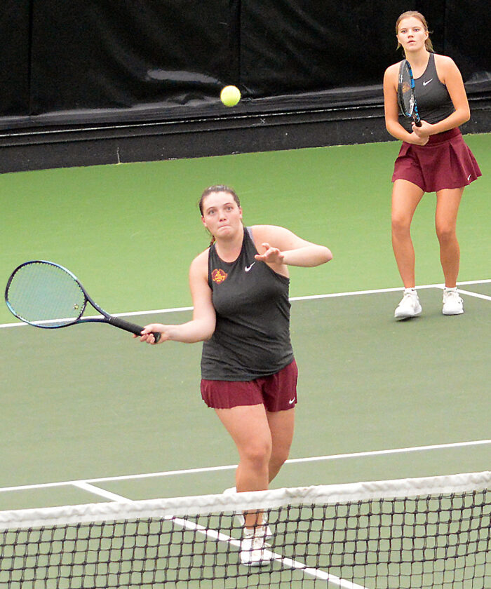 STATE-QUALIFYING SHOT — Blue Earth Space’s Grace Hanson steps right into a forehand return as doubles companion Olivia Dutton appears to be like on throughout Part 2A particular person tennis motion on the Swanson Tennis Middle on the Gustavus Adolphus School campus in St. Peter. Hanson and Dutton went on to position second and netted a visit to the Class A state competitors. (Picture by Charlie Sorrells)