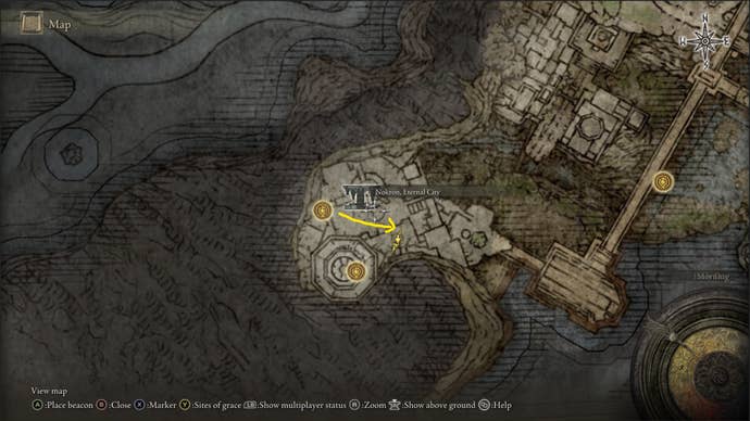 Just like the Mimic Tear above, the Greatshield Troopers are present in Nokron, Everlasting Metropolis. However this time, they’re simply within the high proper nook of the courtyard proper in entrance of the Nokron, Everlasting Metropolis Website of Grace.